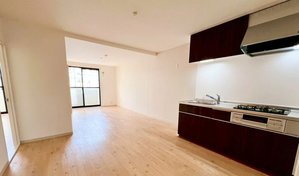 キッチンからリビングまで奥行きがあり、ダイニングテーブルやソファもゆったり配置できる間取りです。