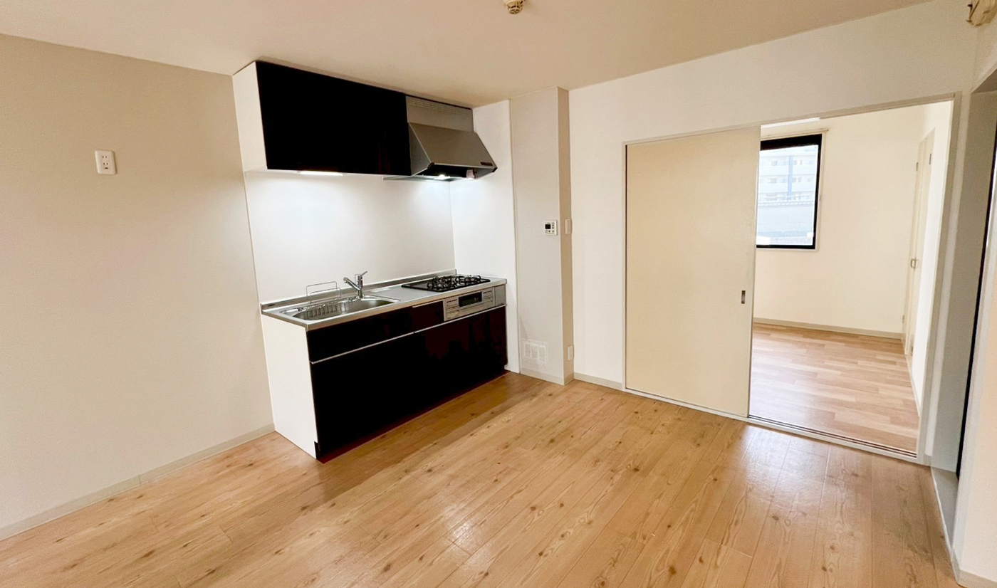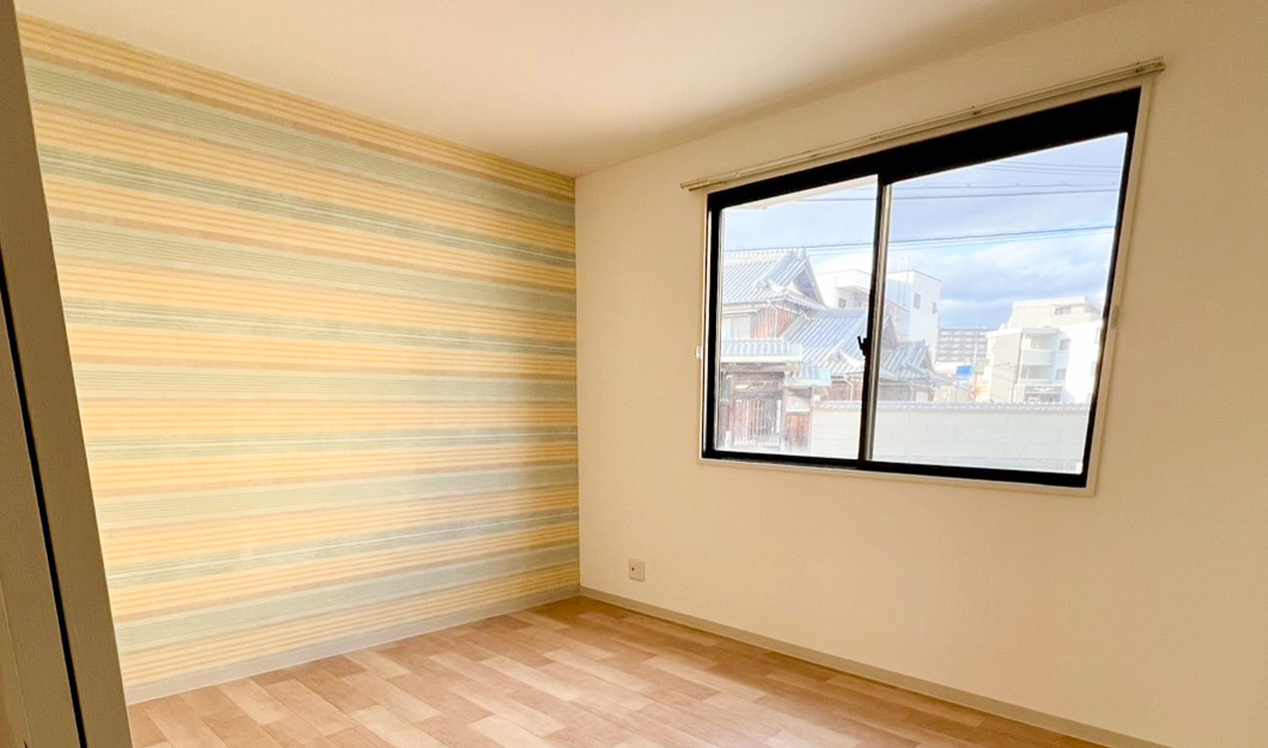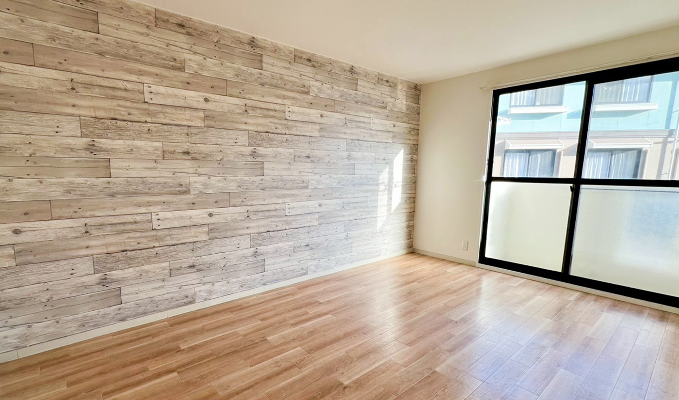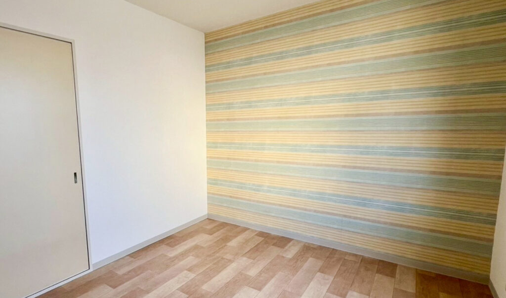 室内は、木目調のフロアと遊び心のあるアクセントクロスが調和した、温かみのある空間に仕上がっています。